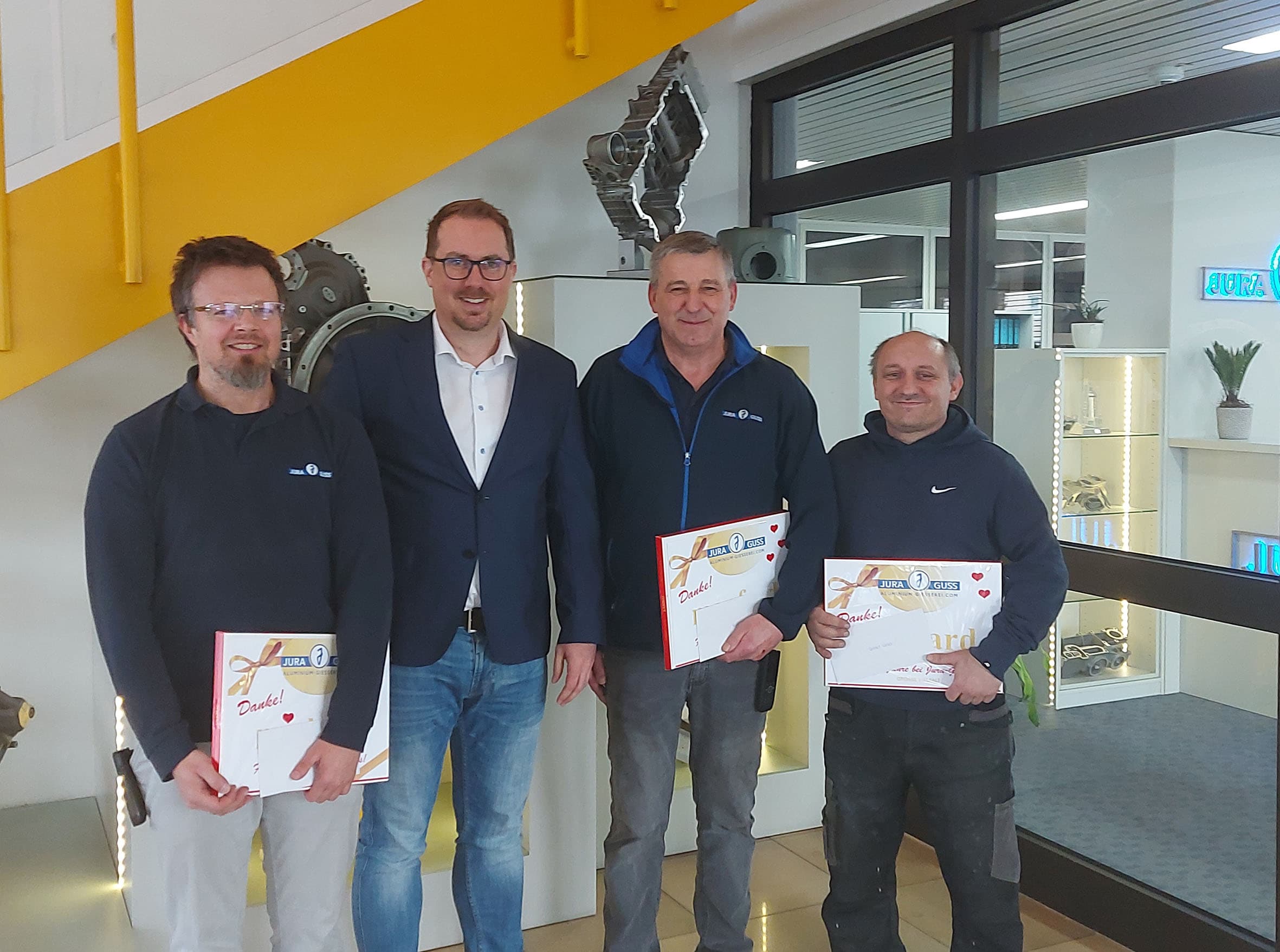 Am 27. Januar 2025 gratulierte Geschäftsfüher Philipp Teschke drei langjährigen Mitarbeitern zu ihren Betriebsjubiläen und dankte ihnen für ihr langjähriges Engagement für die Jura-Guss GmbH.